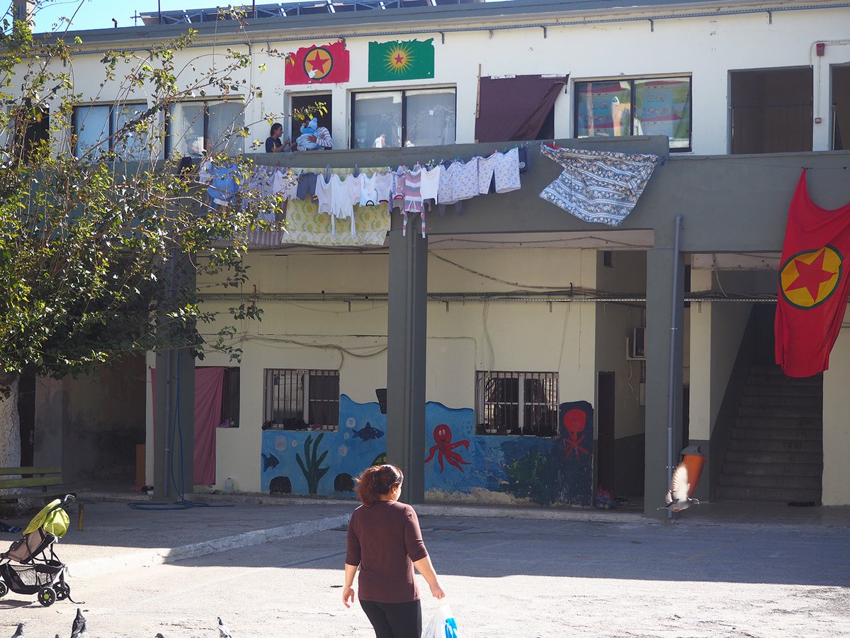L’organisation interne du camp, l’auto-administration sur le principe du confédéralisme démocratique, n’est pas étrangère aux pressions qui ont mené au désengagement de l’Etat grec, les pressions de l’Etat turc se basant sur la présence du PKKPartiya Karkerên Kurdistan, Parti des Travailleurs du Kurdistan, fondé en 1978. More et son contrôle idéologique sur le camp pour demander sa fermeture. Organisé en comité et en assemblée populaire, le camp est autogéré par ses habitants qui assurent la sécurité, l’éducation et la répartition de denrées alimentaires. Le principe des communes permet aux habitants du camp – et de ses différents lieux de vie – de veiller à son bon fonctionnement, en participant concrètement à son organisation et à la répartition des tâches. Expérimenté également au RojavaKurdistan occidental (Kurdistan de Syrie), divisé en trois cantons : Cizirê (le canton le plus peuplé comprenant notamment la ville de Qamişlo), Kobanê et Efrin. More – Fédération du Nord-Syrie – le projet politique prend dans le cadre spécifique du camp une forme particulière, puisque s’y mêlent les problématiques migratoires, c’est-à-dire le mouvement, l’attente et le renouvellement permanent des occupants du camp. Il est cependant évident que les conditions de vie y sont nettement meilleures que dans la majorité des autres camps de réfugiés, même ceux soutenus par l’Etat grec. Les liens avec la société civile grecque étant très forts, construits sur une longue amitié entre les Kurdes et les Grecs, le camp n’est pas isolé du reste de la société grecque et est même au contraire pleinement intégré à la vie économique et sociale du quartier et de la ville.