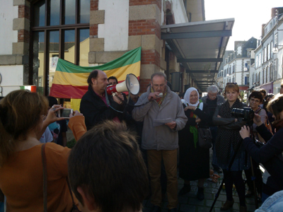 Les militants de l’antenne du Finistère des AKB avaient organisé une matinée de débats et de rencontres autour d’un lieu stratégique à Douarnenez : les Halles, fréquentées un samedi matin par de nombreux Douarnenistes. Des Kurdes sont venus de partout (Lesneven, Morlaix, Plouescat…). Kebab, crêpes, sardines, librairie, jeux pour enfants, photos, films, discussions avec la participation de Laetitia Gaudin-Puil, journaliste de retour du Kurdistan d’Irak et de Jean Ladan qui, lui, retourne au Kurdistan d’Irak, cette fois-ci, dans un camp de réfugiés de la frontière syrienne, avec le fruit de la collecte (1 000 euros) dans le but d’acheter des chauffages à gaz avant l’hiver. Des prises de paroles, des chants kurdes, deux cent personnes ont manifesté leur soutien à Kobanê. Michel Le Hir, secrétaire des AKB, a rappelé l’objet de cette manifestation : Depuis quelques mois le groupe armé « Daesh » sème la terreur en Irak et en Syrie. Fort de la chute de la ville de Mossoul sans grande résistance, il s’est lancé dans une conquête territoriale tous azimuts et particulièrement vers les zones de peuplement kurde, chrétien et yézidi.